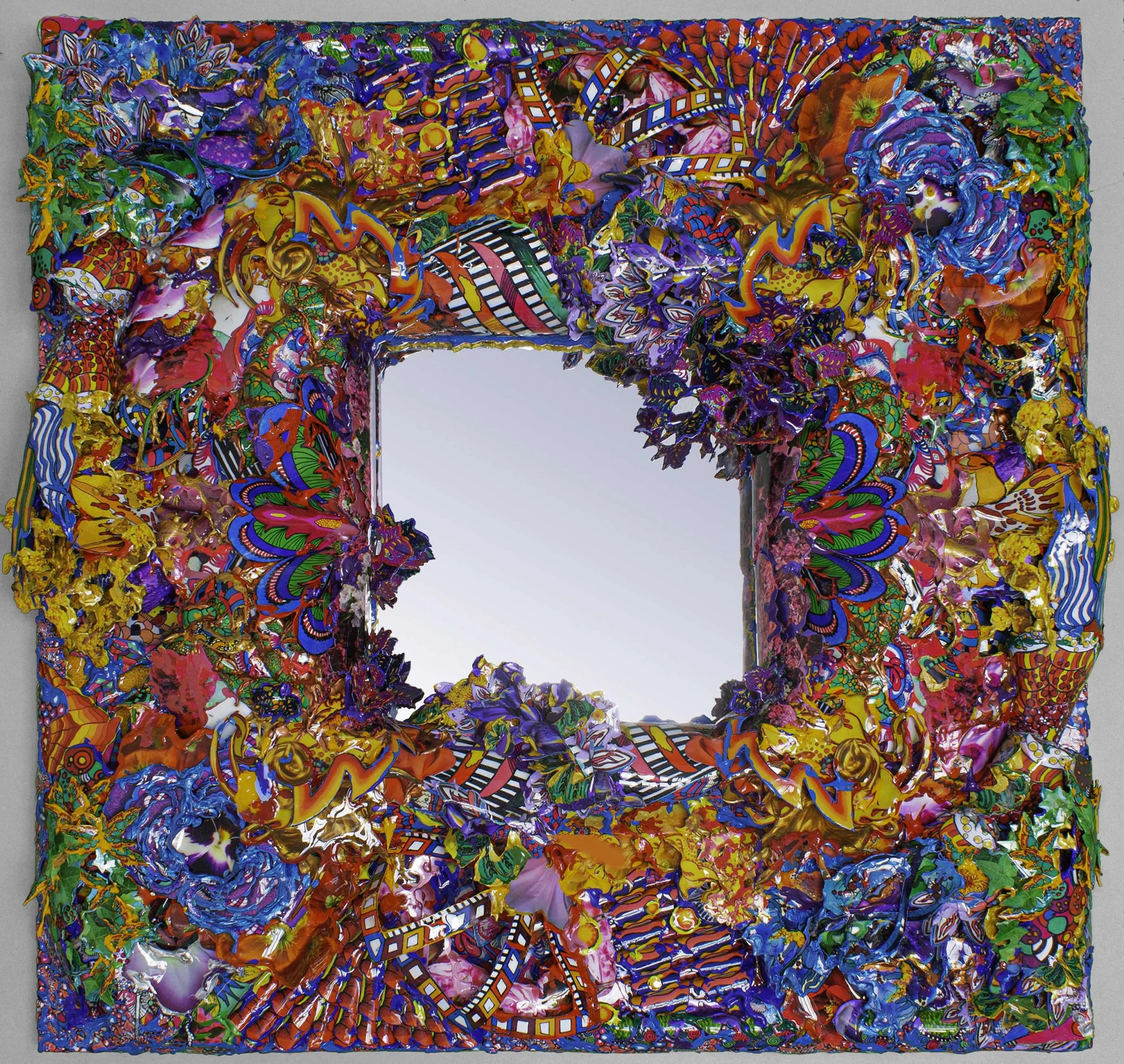 Inspired by the natural process of ambient illumination, these conceptually sculptured mirror pieces are a celebration of the interplay between colour, light, and organic forms. Each piece is meticulously crafted using a combination of documented images and abstract illustrations, strategically arranged in patterns that evoke the dynamic and fluid nature of ambient illumination.