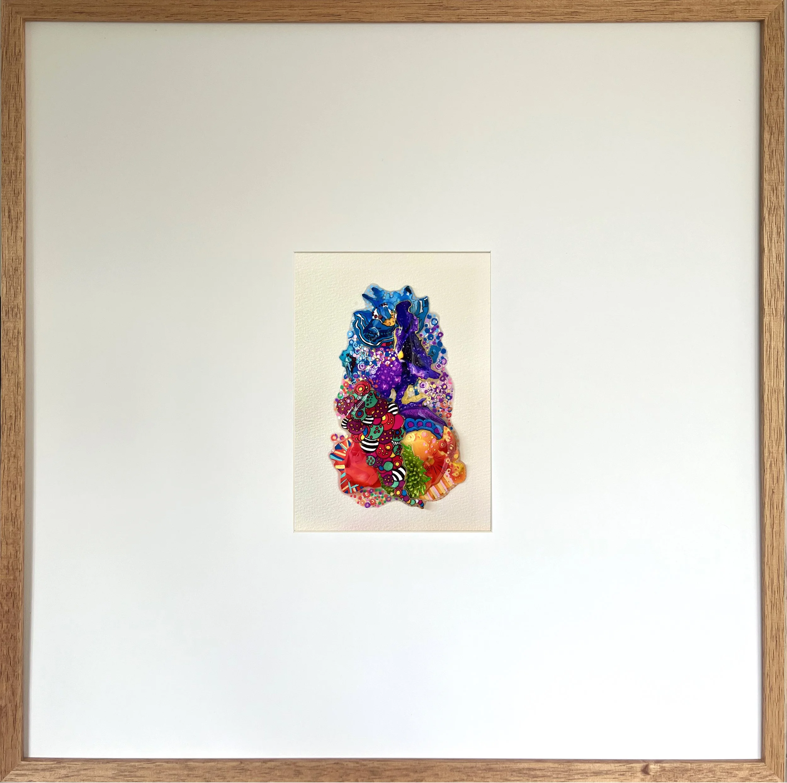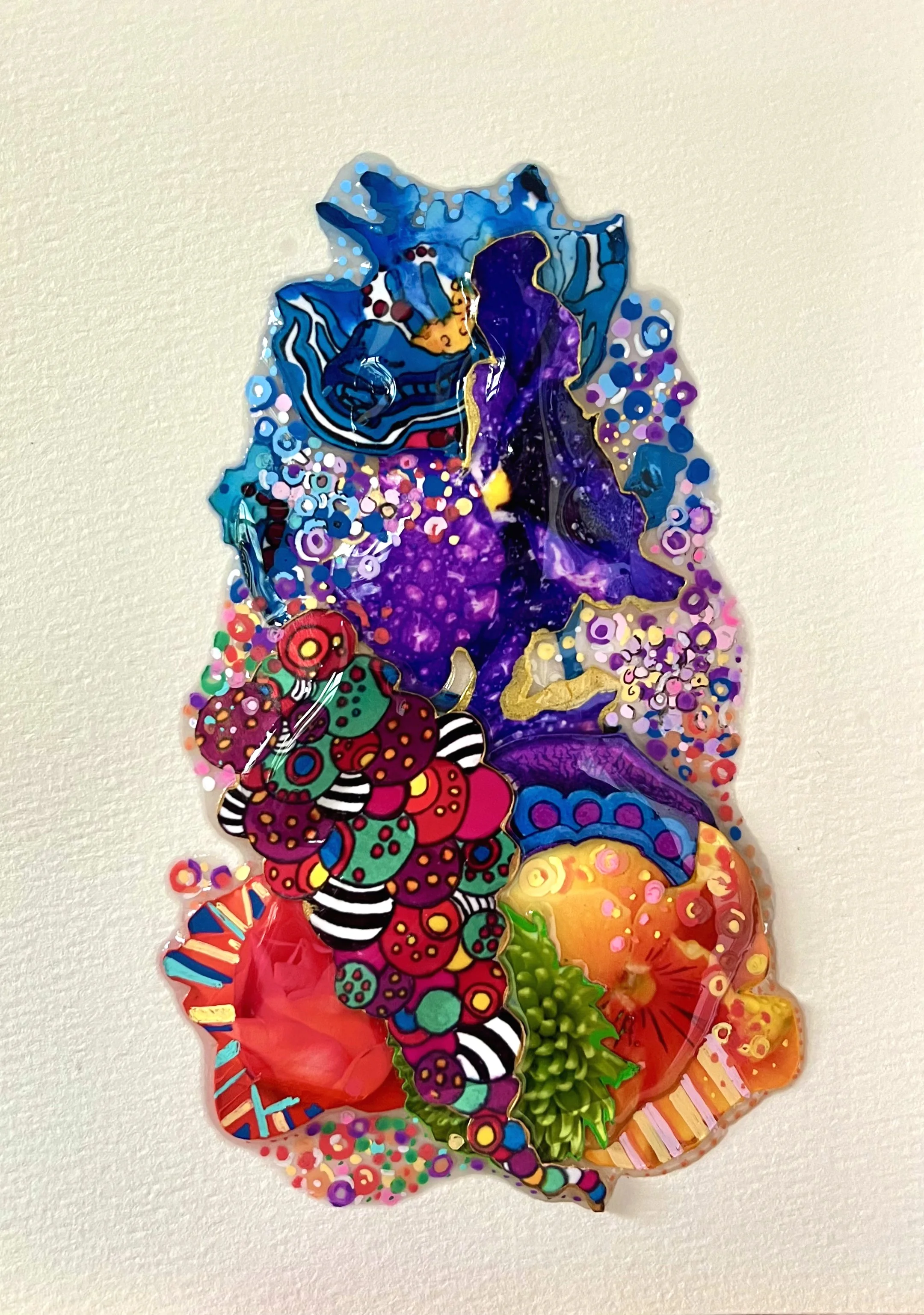 Mixed media composition in resin, acrylic, and layered paper on archival card