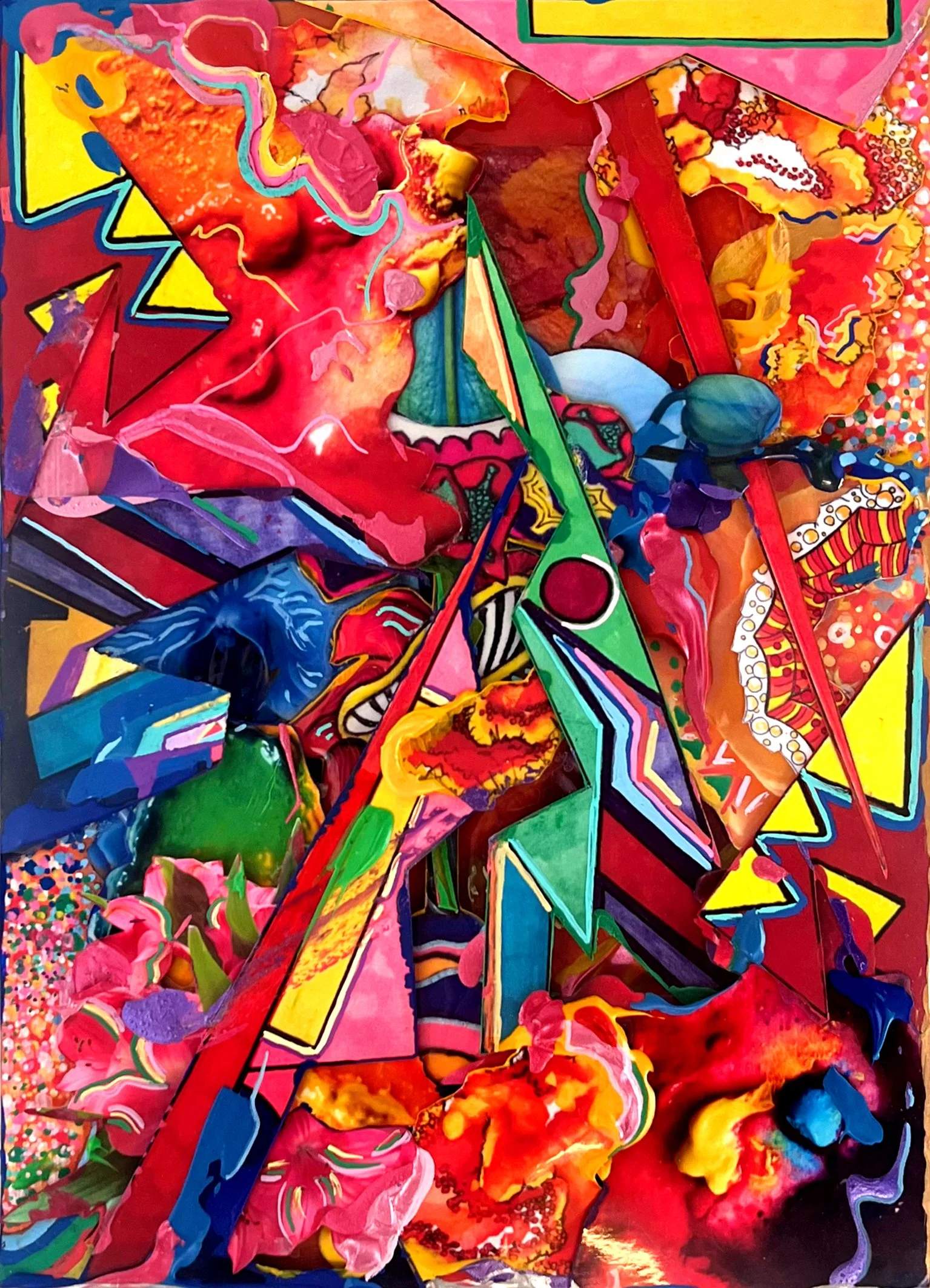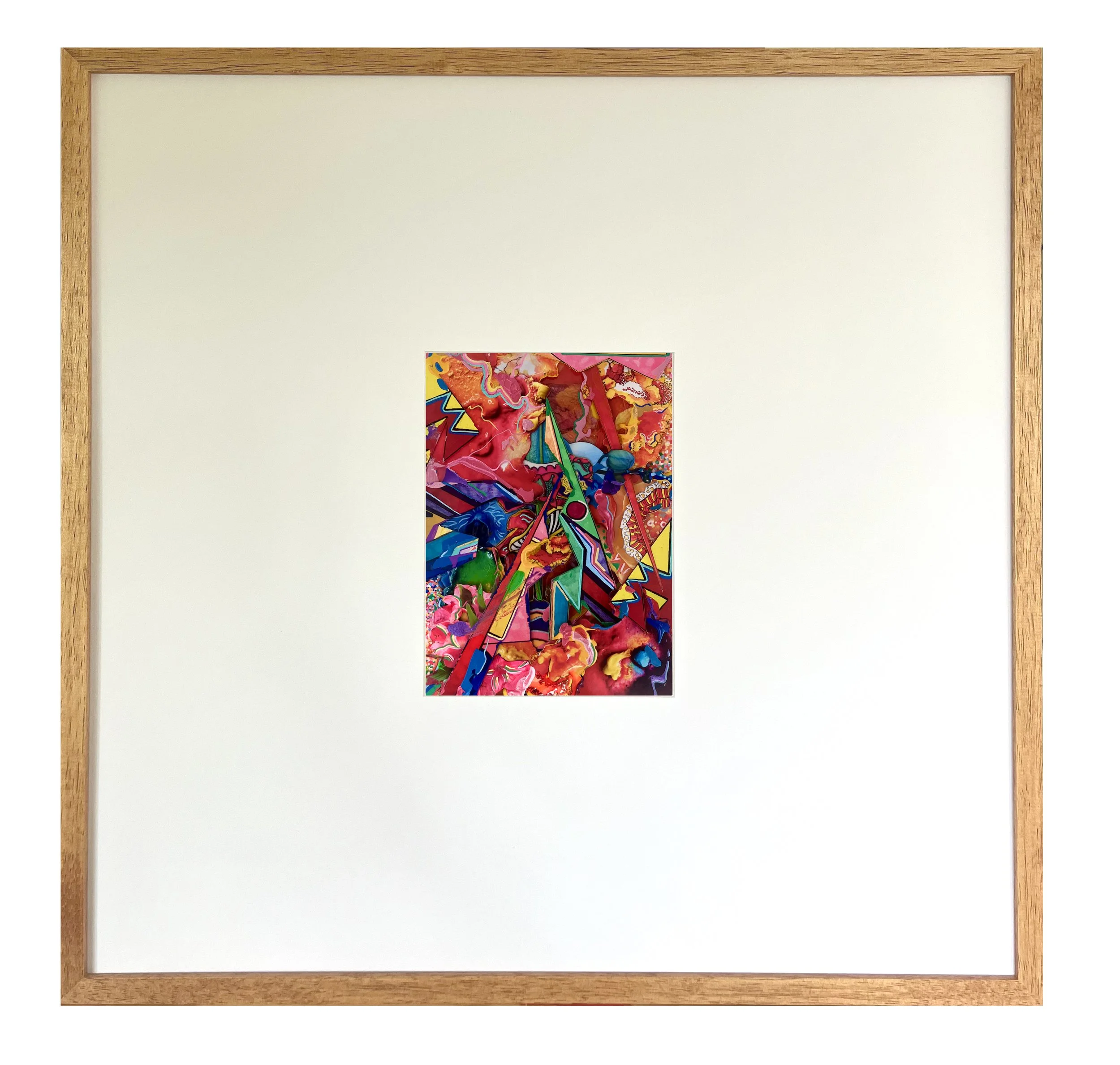 Displayed in a large mount, the piece plays with the tension between chaos and structure. Bold, angular forms intersect with fluid, organic textures. Its bright palette and energetic composition create a sense of explosion and depth, as though capturing a moment cut directly from a vibrant, living world.